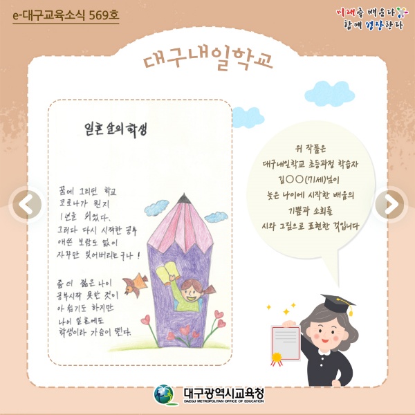 배움의 기회를 놓쳐 초등학교 중학교 졸업장이 없는 18세 이상 성인에게 교육의 기회를 제공하고 학력을 인정받을 수 있는 대구내일학교에서 학습자를 모집하고 있습니다. 대구광역시교육청에서 무료로 운영하고 있는 대구내일학교에서 배움의 꿈을 이룰 수 있습니다.