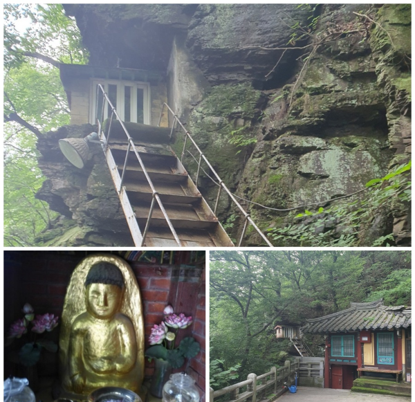 돌계단을 올라와 우측엔 미륵전과 관음전이 있고 좌측 바위 모퉁이를 돌면 용왕님을 만날 수 있습니다. 뜻박의 위치에서 물기 많은 바위에 자리하고 계신 용왕닙입니다. 낙산사 홍련암 용왕님과 견줄 만큼 작은 크기입니다.