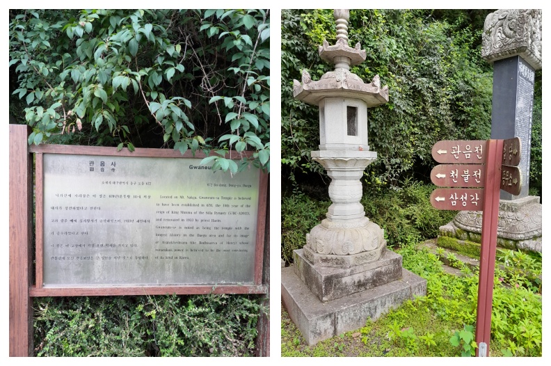 해탈문을 지나 들어서면 공덕비와 이정표 관음사 창건 설명이 있습니다. 천년 고찰의 관음사입니다. 주불인 관세음보살이 모셔진 관음전 아래 무설전이 크게 자리하고 있습니다. 용선의 모습을 본떠 만들어 용머리가 불을 뿜으며 나아가고 있는 모습니다.