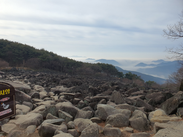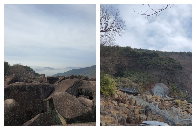 주차를 하고 돌아보면 바로 옆에 스님이 일러주신 물고기가 변했다는 바위 계곡이 펼처지고 계단을 올라 도착하는 만어사가 보입니다. 만어산을 오를 때 산허리에 있던 운해가 멀리 내려다 보입니다.