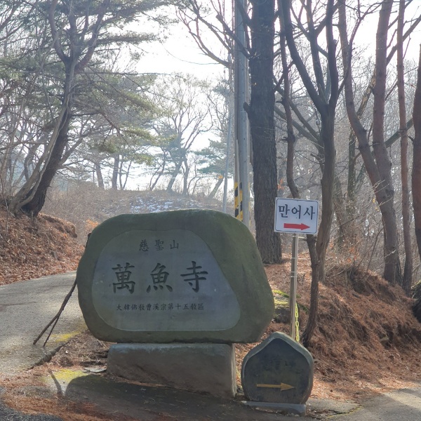 고속도로에서 멀지 않고 산길이지만 절 바로 앞 주차장까지 차로 올라갈수 있어 어르신들 모시고 오기도 좋은 곳입니다. 구불구불 산길을 올라가면 만어사 표지석이 보입니다.