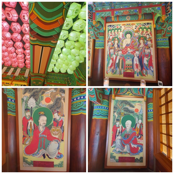 연분홍 연노랑 연등이 예쁘게 나란히 달려있는 삼성각입니다. 탱화가 크지 않지만 가까이서 볼 수 있어 이모저모 들러보았어요. 산신과 함께 있는 호랑이를 좋아해서 꼭 찾아보는데 요기 호랑이는 민화 속 까치 호랑이처럼 생겨 귀여웠습니다.