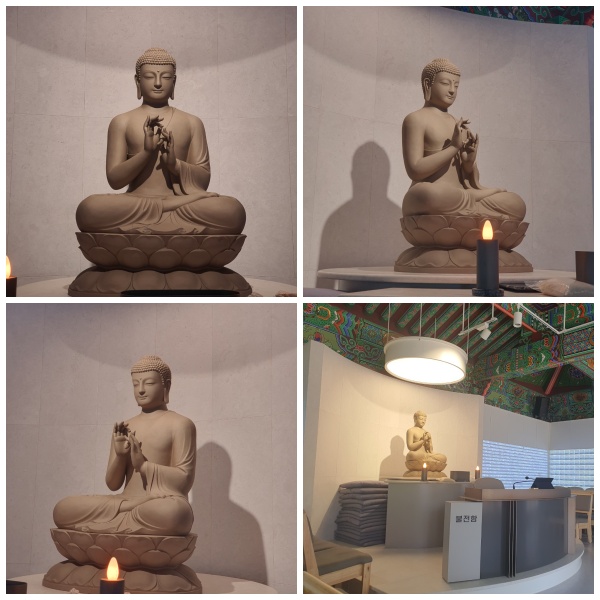 대웅전의 문이 폴딩도어로 되어 빛 반사만 아니면 안쪽 부처임 모습이 그대로 보입니다. 삼배후 앉아 바라보고 있으니 절로 기분이 좋아집니다. 벽면을 둘러싸고 있는 인등이 조명이 되고 벽이 되어 법당을 환하게 밝히니 어둡지 않아 참 좋았습니다. 가운데 자리 외에는 의자가 놓여 있어 어르신들 배려에 감사했습니다.