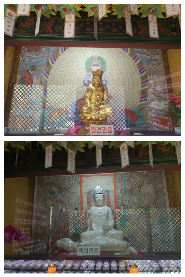 보살님 중 폭포에 나타나시는 랑견보살님을 모시고 있어요. 함께 모신 백의관음보살님은 처음으로 뵙는 모습인데 두 보살님 모습에 빠져듭니다.