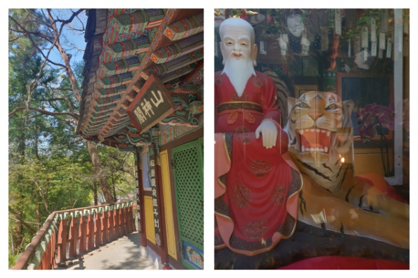 산신과 호랑이 나반존자님이 유리관 안에 모셔져 있습니다. 옆으로 물 흐르는 소리가 시원하고 앞으로 내려다보는 계곡이 보기 좋은 곳이에요.