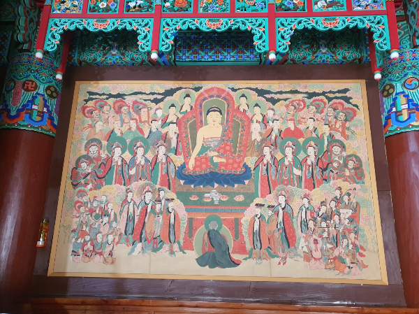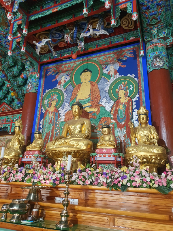 탱화의 색감이 쨍하지 않고 전체적으로 온화한 기운이 감도는 대웅전입니다. 사찰 가시면 분위기가 무섭다고 하시는 분들도 거부감 없이 들어가 좋은 느낌을 받을 수 있습니다.