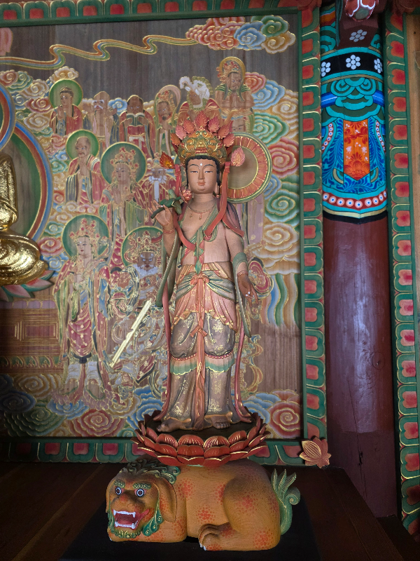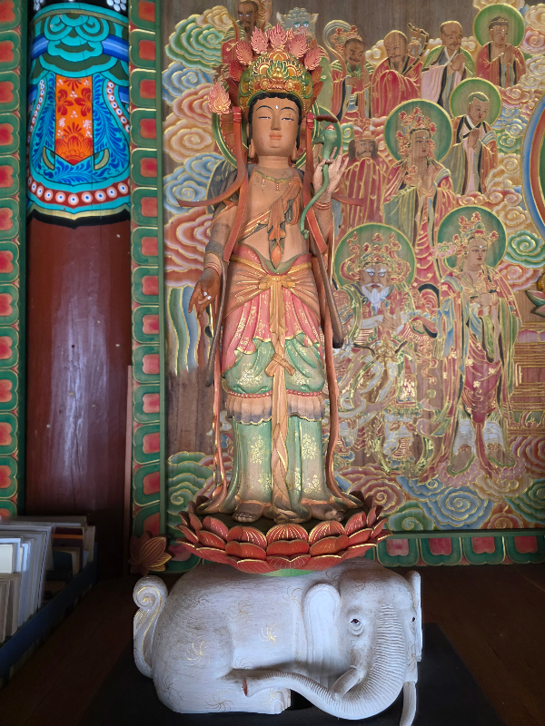 사자를 타고계신 지혜의 문수보살님 흰코끼리를 타고계신 실천의 보현보살님을 뵐수 있어요. 그림으로보는것과는 달리 보현보살님 문수보살님이 아주 세밀하게 조각된모습이예요.
