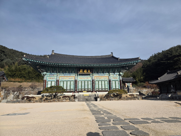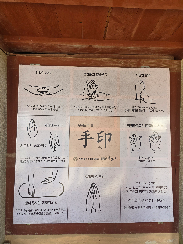 대웅전으로 오르는 입구에는 오는이들을 반기는 '피안으로 딛고 오소서'라는 글과 오른편에는 부처님 수인을 설명해주고 있어요.