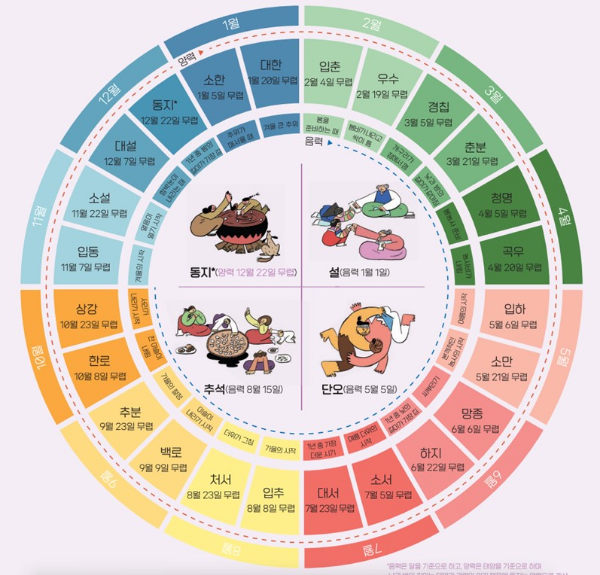 국립민속박물관에서 한국의 일년을 사계절과 24절기 그속에 매월마다 시기를 알려주는 전시가 있었습니다. 일년 4계절 24절기의 의미와 명절과 절기의 시기를 음력과 양력으로 언제쯤인지 알아보겠습니다. 월과 24절기는 양력기준이며 명절은 음력기준입니다.