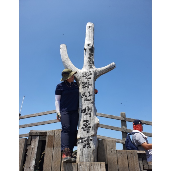 저는 몸살 기운에 약 먹고 올라 기운을 모두 소진해 꼼짝하기 힘들어 앉아 쉬고 함께 간 언니들은 40분을 줄을서 한라산 정상 표지석 기념샷을 찍고 저는 한라산 백록담 나무기둥에 기념사진을 남겼습니다. 정상 표지석 사진을 못 찍었지만 후회는 없습니다. 점심을 핫 앤 쿡 발열 도시락을 챙겨 와서 간간하게 먹고 주변 정리를 했습니다.