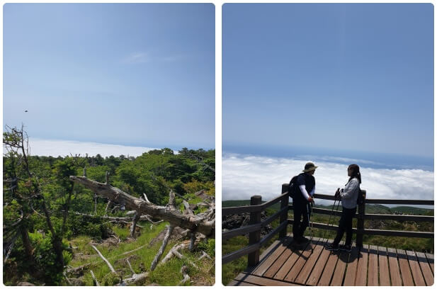 진달래밭 대피소에서 정상으로 출발하려니 입출구 게이트가 있습니다. 점점 위로 올라갈수록 풍경이 눈에 들어고 뉴스에서만 보던 구상나무가 펼쳐집니다. 이때부터 뜨거운 햇빛과의 싸움입니다. 날씨는 너무 좋아 파란 하늘에 흰구름이 발아래 있지만 나는 태양과 더 가까우니 힘들고 지치고 뜨거운 태양까지 나를 힘들게 하고 정상 근처 무한반복인 나무 계단은 인내심의 한계를 부릅니다.