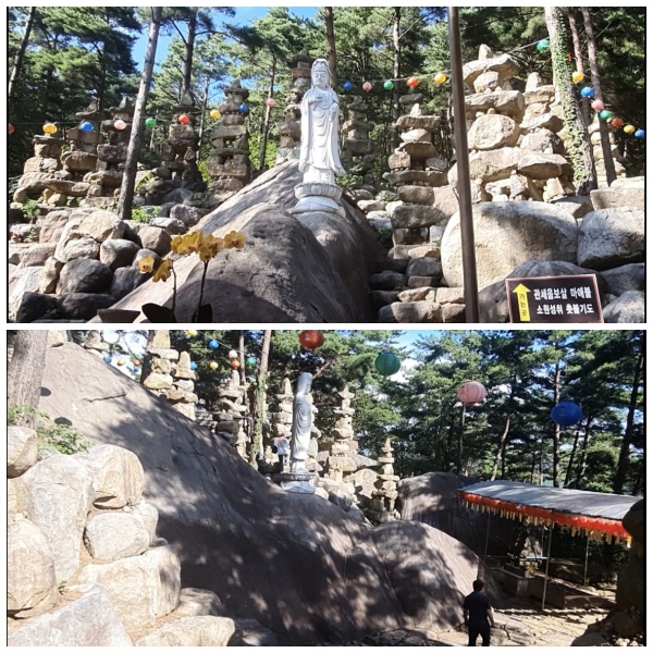 소원리본이 가득 달린 소원성지 길을 올르면 용바위위에 관세음보살님을 만날 수 있습니다. 앉아서 아래를 내려다보고 있으면 더운 날씨에도 선선한 바람이 불어 잠시 머물며 기도하기 좋은 곳입니다.
