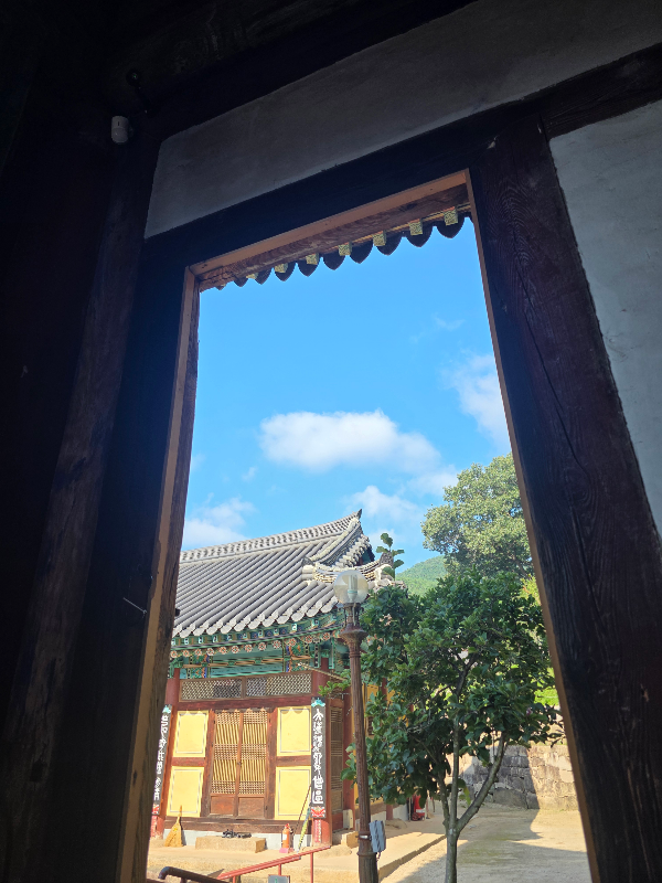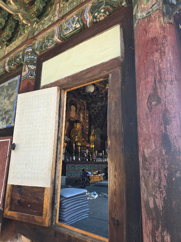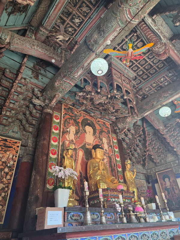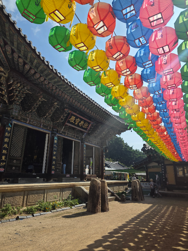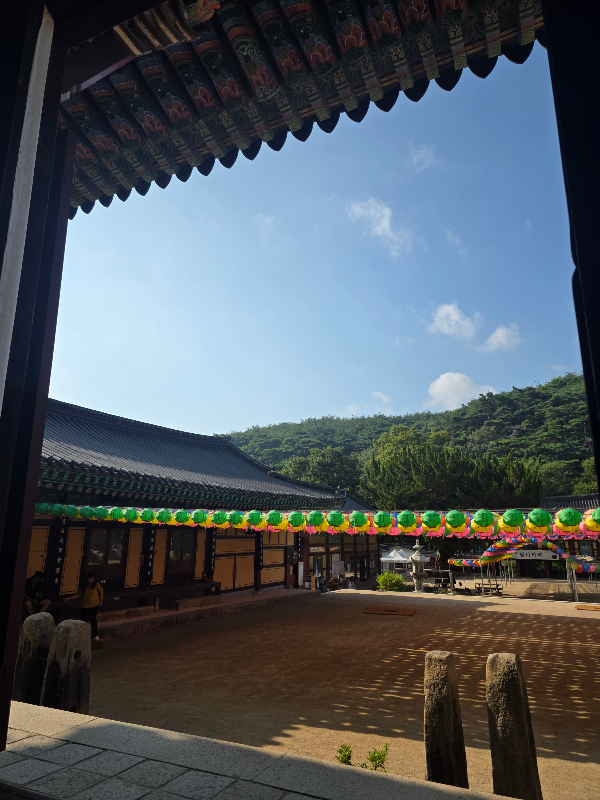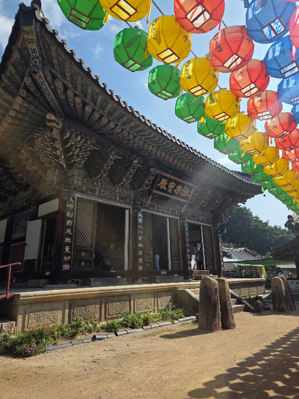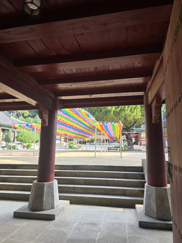 보화루를 지나면 극락보전앞 오색연등이 보입니다. 백중기도 회향하는 날 행사준비로 지장전 앞이 분주한 모습이었어요. 그래도 들어가 우리가 그간 읽은 지장경과 기도를 잠시 마무리하는 시간을 가졌어요.